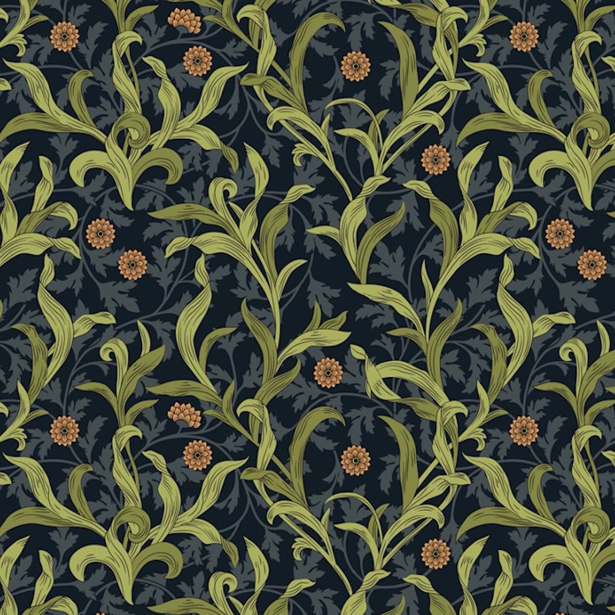 The Willow wallpaper inspired by William Morris features intricate, flowing willow branches in a harmonious blend of blue, green, and charcoal. The design captures natural elegance, with detailed motifs creating depth and a serene, timeless atmosphere.