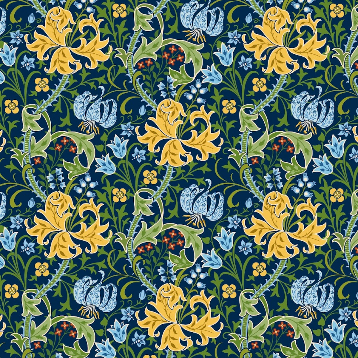 The Golden Lily design by William Morris is one of the most iconic and celebrated patterns created during the Arts and Crafts movement. First produced in 1878, this wallpaper design exemplifies Morris's philosophy of integrating beauty and craftsmanship, drawing inspiration from nature and traditional artistic techniques. Inspired by the original Golden Lily wallpaper in colors for modern living.